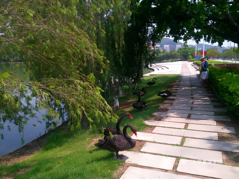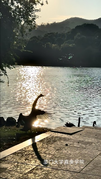 栖霞凌波映黑鹅,静享湖畔好时光。