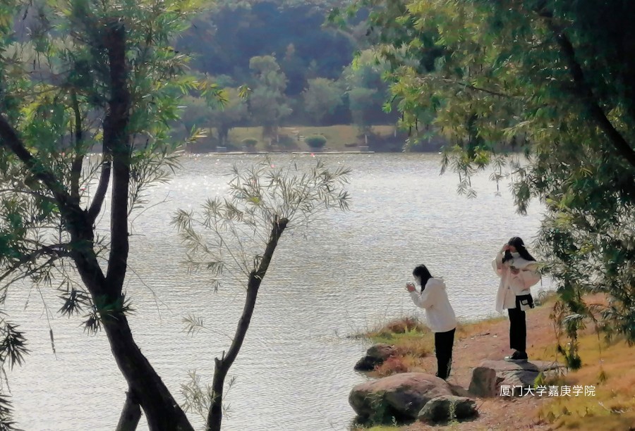 初春,嘉庚学院北区翠湖春晓湖畔,嘉庚学子正拍摄着湖中美景。人与景,尽显岁月静好。