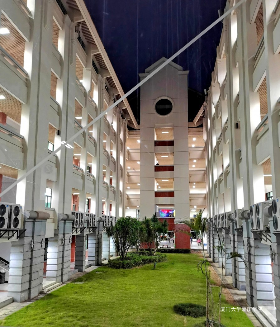夜晚,主楼群灯光亮起。嘉庚学院的白色建筑的透视之感,有着无限的优美和端庄。