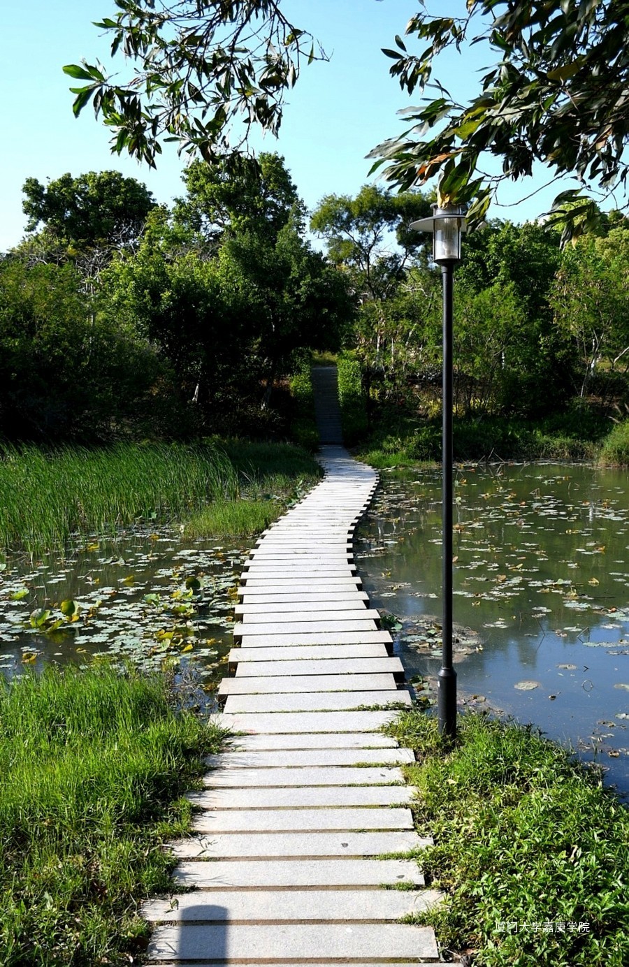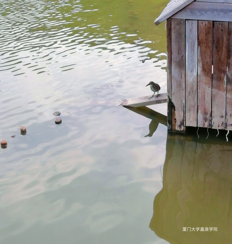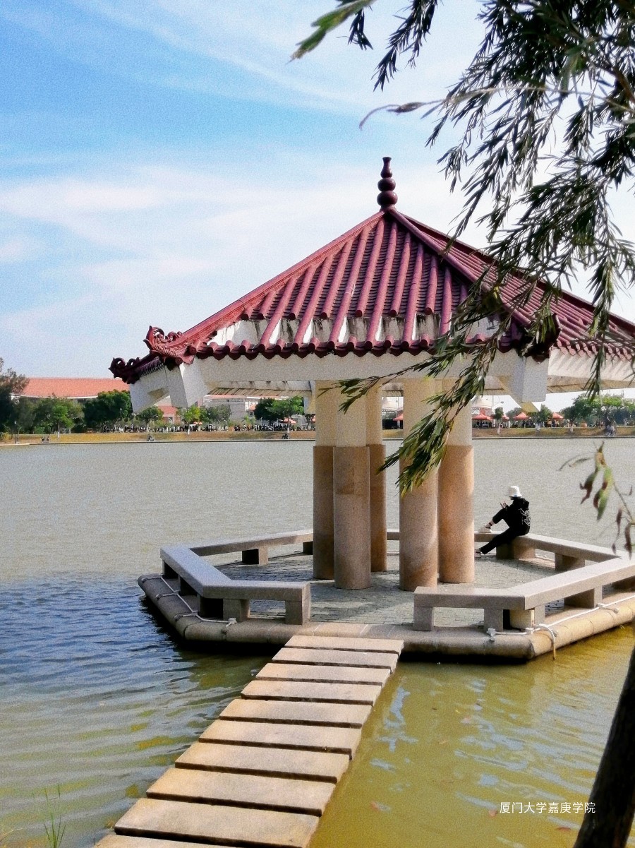 嘉庚学院北区翠湖春晓湖中的小路、亭子、遥望远方的学子,共同构成了美丽的画面。