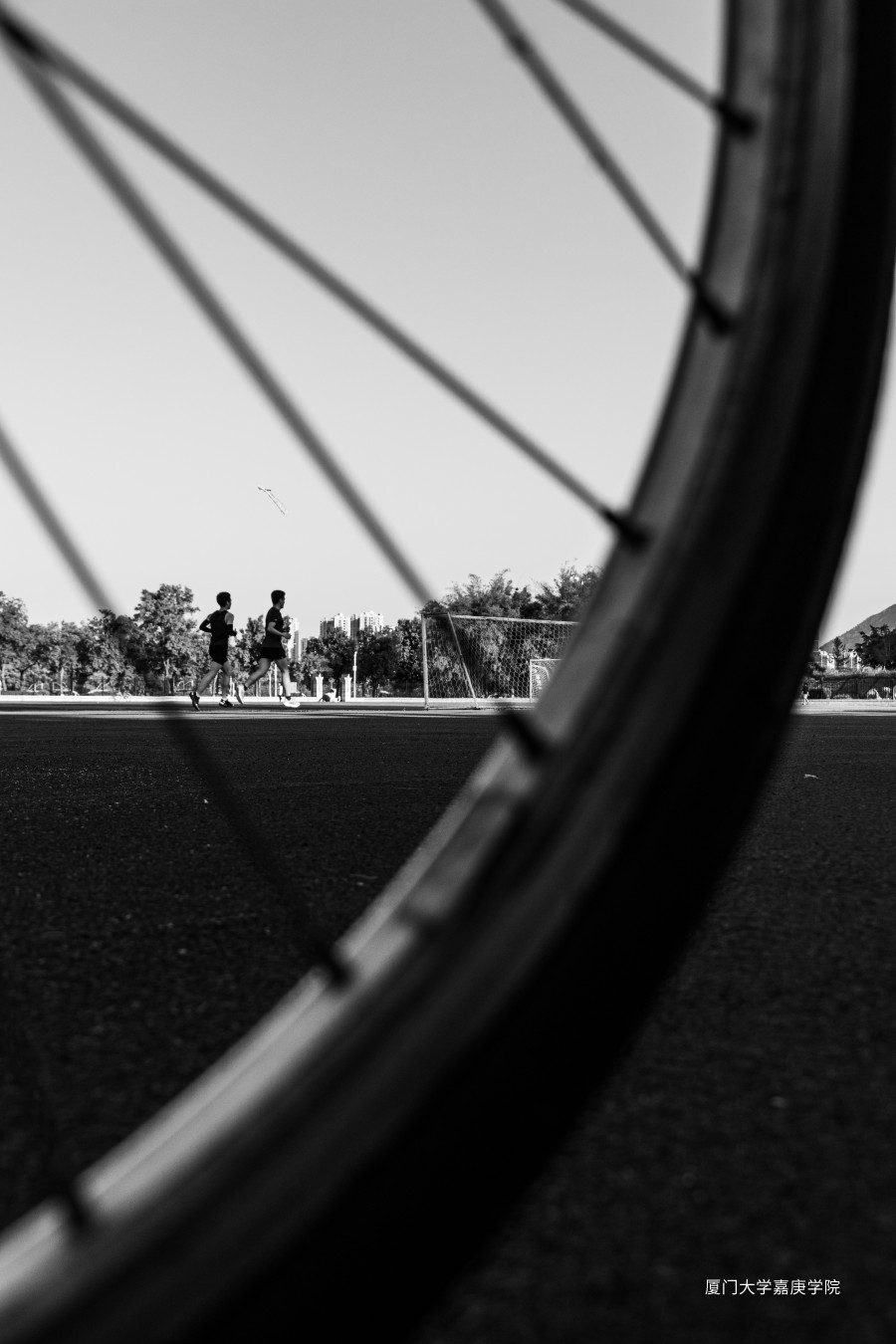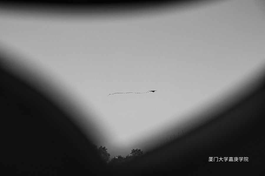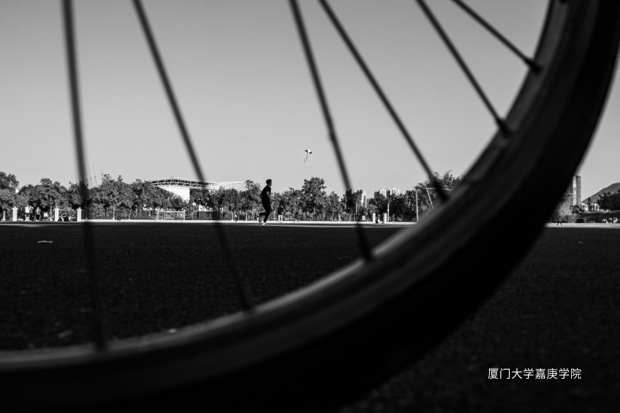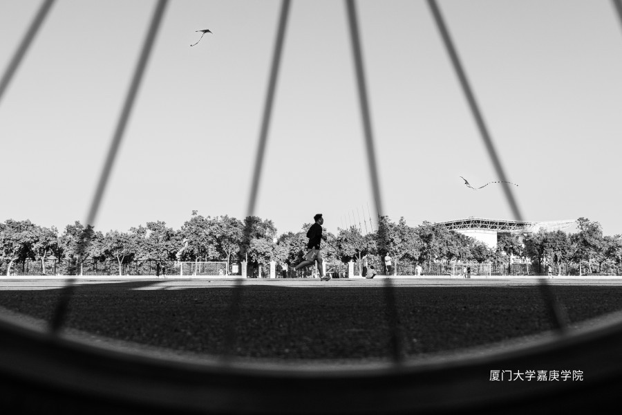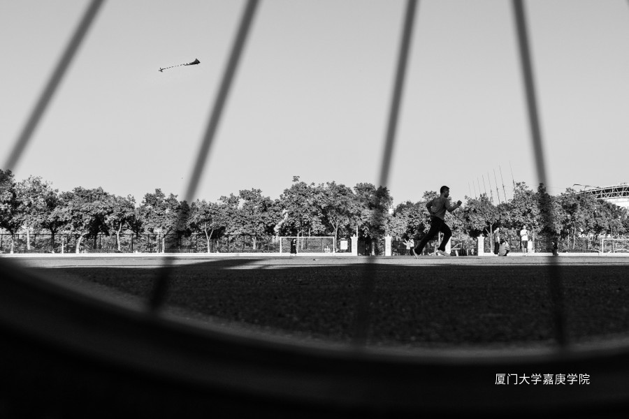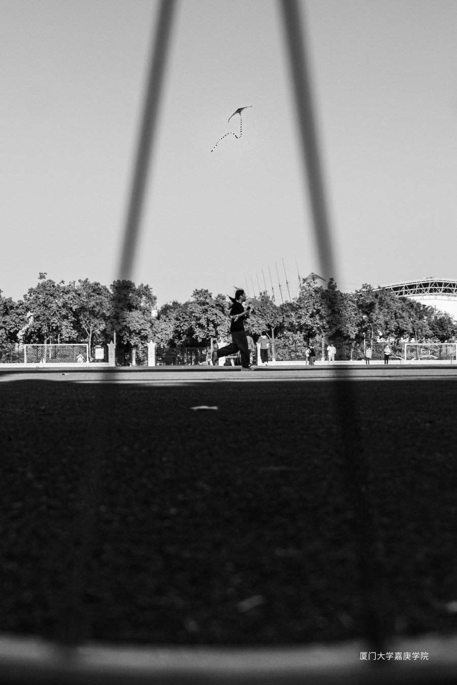 下午在操场上跑步的人,与空中风筝组成了三角形。