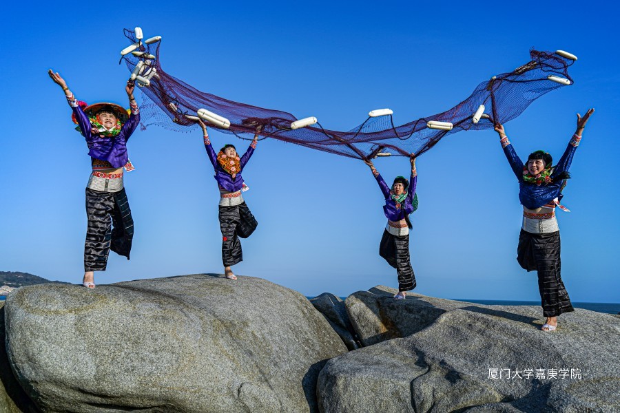 大家快看!四位惠安女把渔网往天空抛去,大家的状态似乎很高兴,也许她们今年捕鱼收获颇丰,正在在以当地传统习俗庆祝呢!