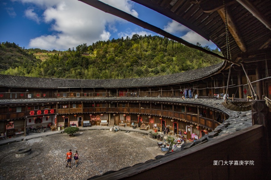 土楼举行一年一度的国际马拉松比赛,而土楼的建筑像上下对称像镜子一样,秉承了中国式的建筑风格,西方友人在马拉松比赛后到此参观。