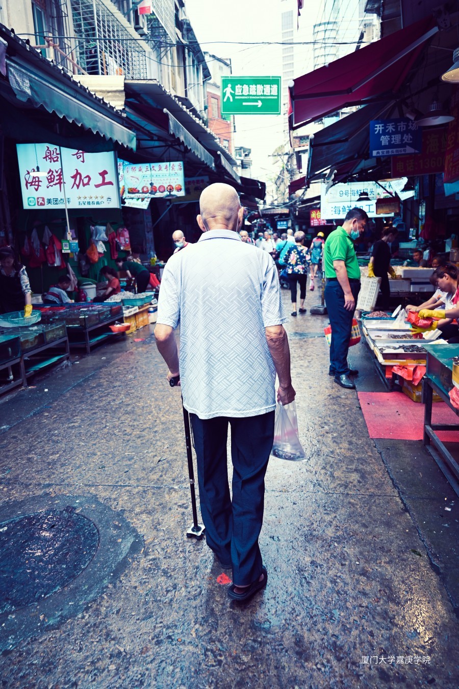 在厦门巴士,一位年迈的老人正步履蹒跚地移动着步伐