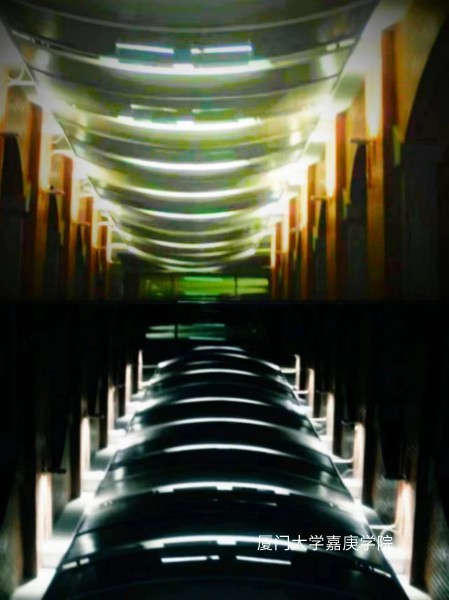 该张照片由拍摄的主楼间连接的过道的顶部构成,一正一倒拼接而成,采用了冷暖两种色调。