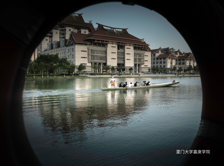 初夏之际,龙舟队在学校湖边上日常训练,利用救生圈形成框架构图,把龙舟队和嘉庚主楼群框在一起,好像一幅画一样,寓意通往成功的明天,向往美好的未来。