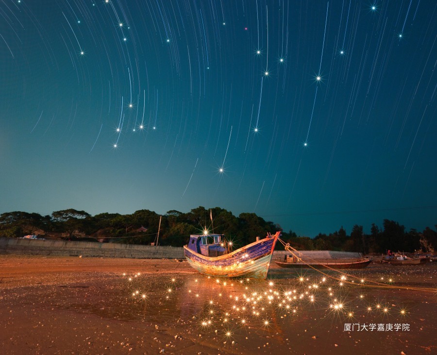 星空下的沙滩上,静静躺着一艘古老的渔船。一起拉伸出极目处的几个世纪,独身遣返的星轨不语,静静地洒落在等待的金色沙滩之上。