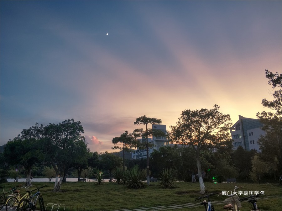 将要落下的太阳对这个今天的告别,与升起的皎月交织的光,这是这一刻的嘉庚,天空是日与夜厮杀的战场
