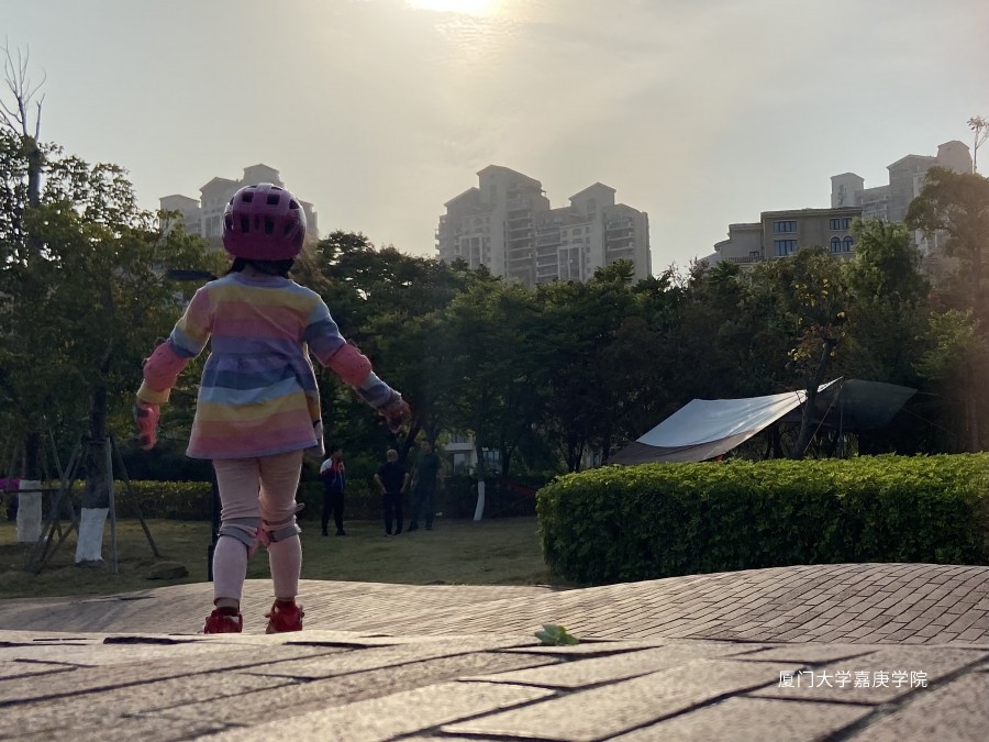 傍晚,落日渐渐收敛它的光芒,一个小女孩穿着轮滑鞋,穿梭在公园里。她朝着前方的光,奔赴她的梦想。