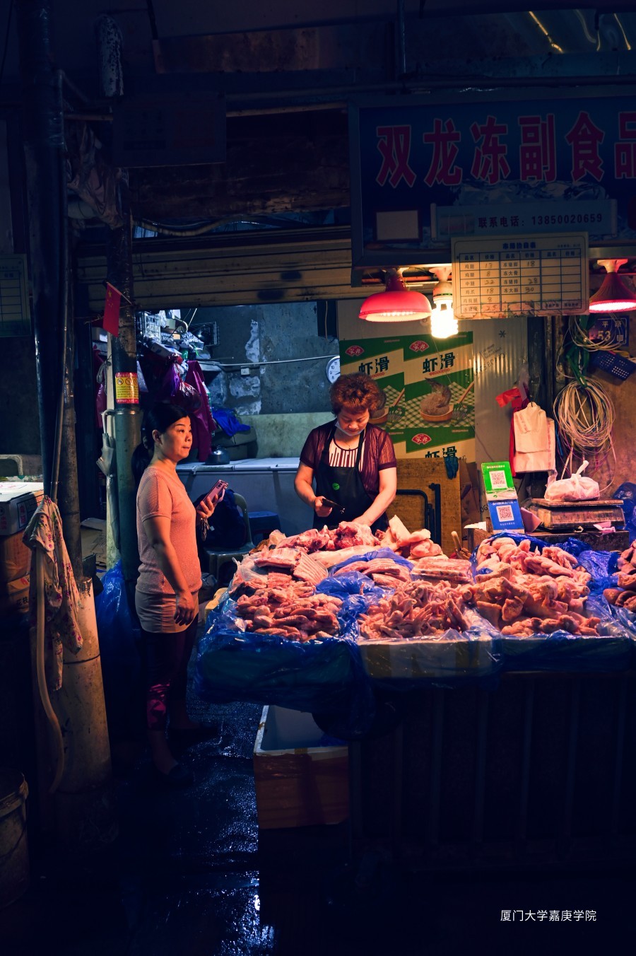 微微的灯光下一位卖肉的妇女在为顾客切肉