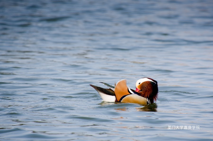 鸳总是在梳理自己的羽毛,就算在水中央也不例外。