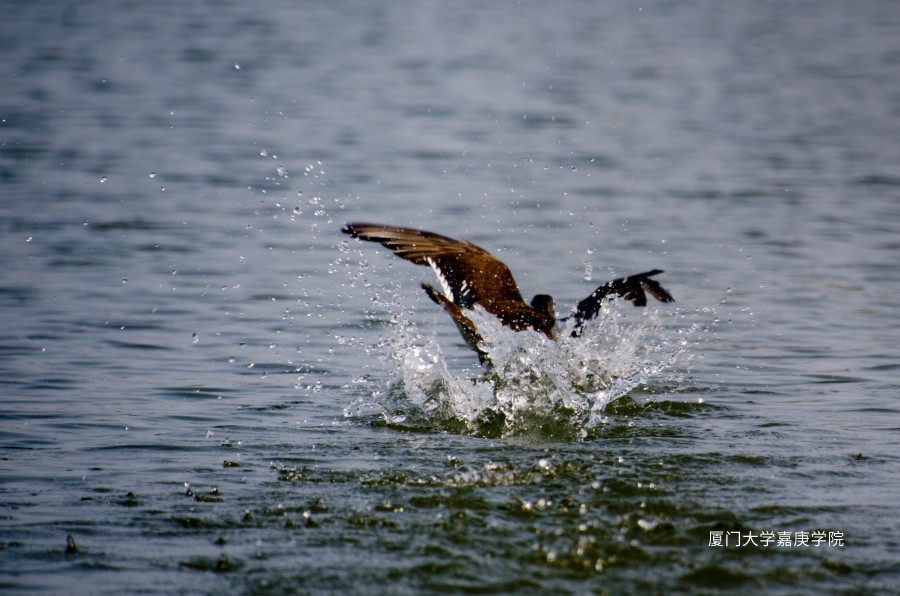 这只雌鸟鸯好像受到了惊吓,在水面扑腾。