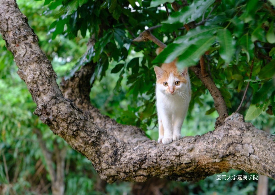 摄于2020年10月24日嘉庚学院龙眼树林,这只小猫其实是右脚有残疾的一只小猫,其他小猫都不愿意和他玩,他总是喜欢独自在这片龙眼树林玩耍,这儿就是他的快乐基地,见到人一点也不怕,好像在和你说:你好呀,和我一起玩吗?