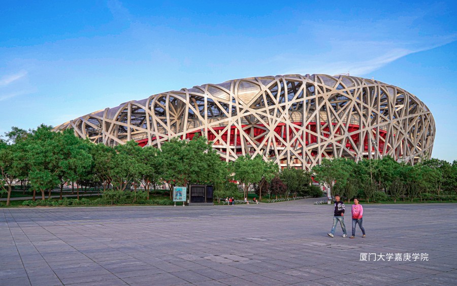 这里是北京“鸟巢”,是国家体育场,2008年北京奥运会举办的地方,附近的居民们经常散步于此。
