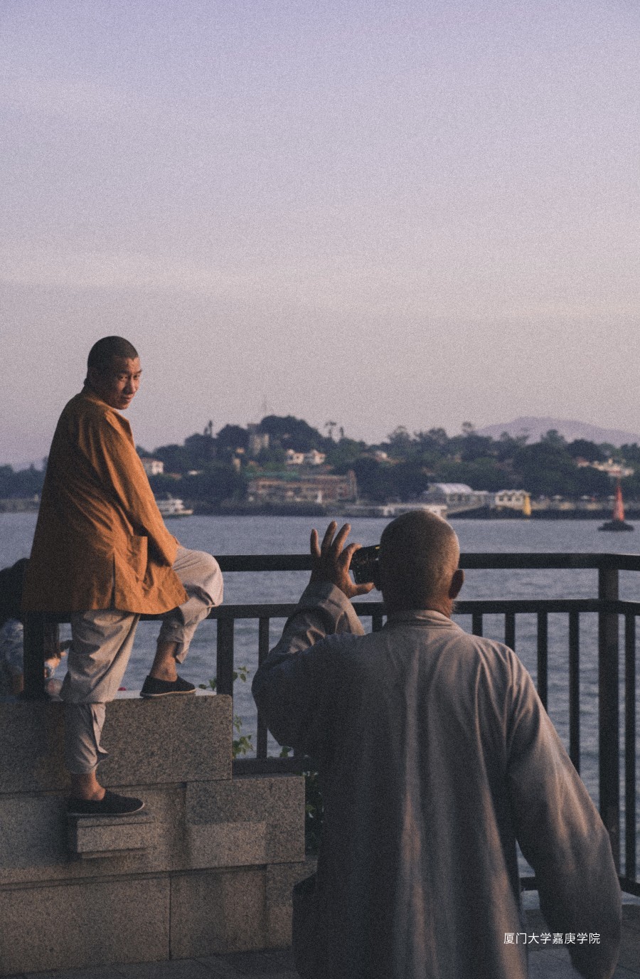 于2020年拍摄于厦门鼓浪屿码头。当时在海边等落日余晖,侧眼发现两位僧侣正在拍照。望着僧侣脸上洋溢的笑容,我不禁感叹这不仅是一种缘分,更是生活美好的真实写照。