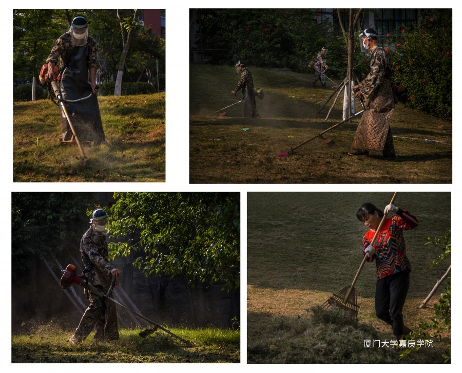 嘉园修草坪的园艺师像一位美容师,让校园变得更美