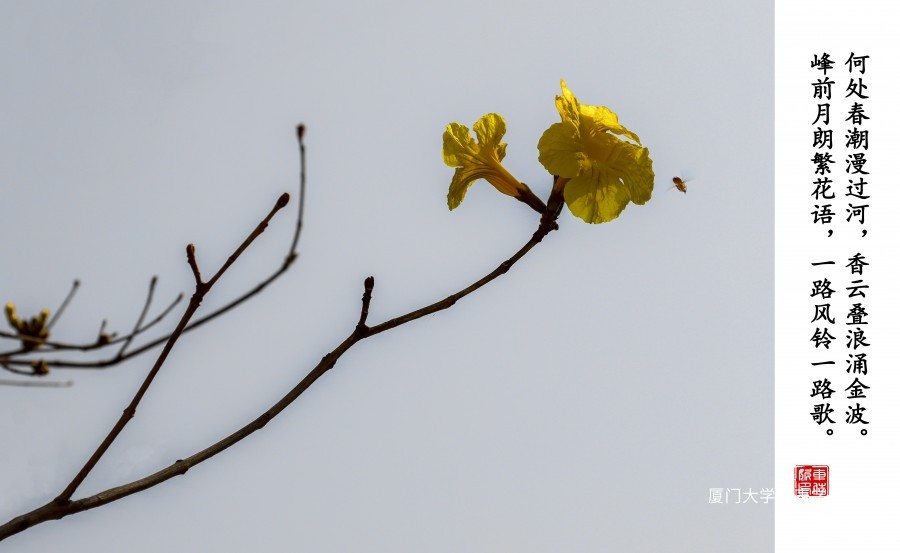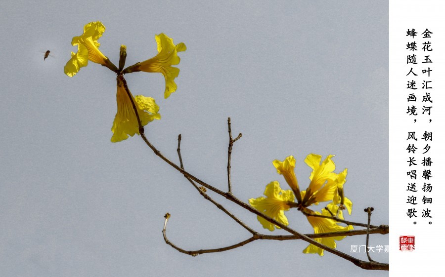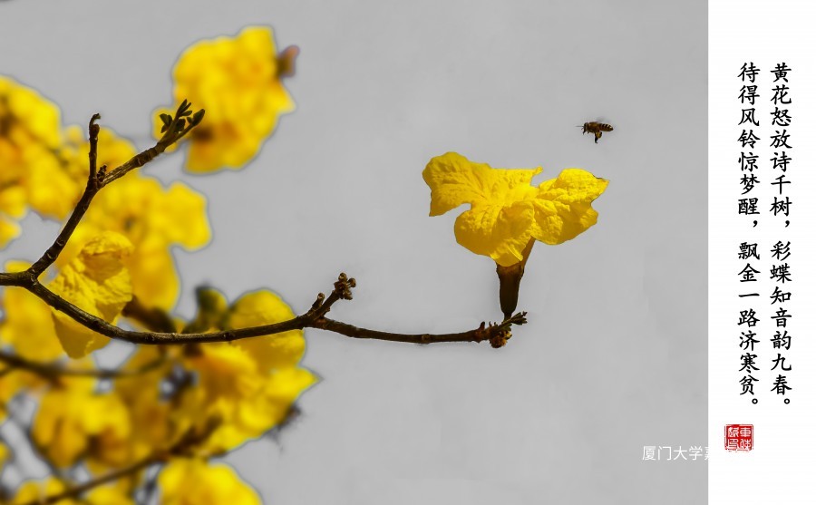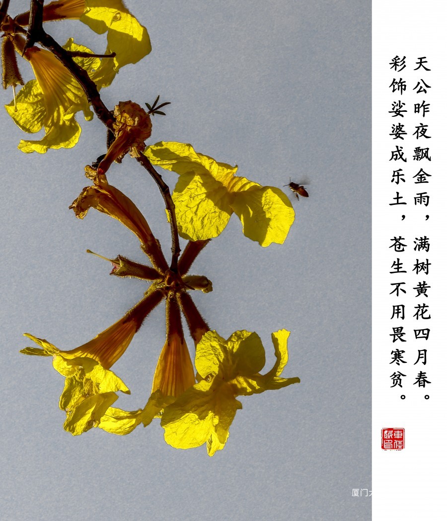 黄花怒放诗千树,彩蝶知音韵九春。待得风铃惊梦醒,飘金一路济寒贫。