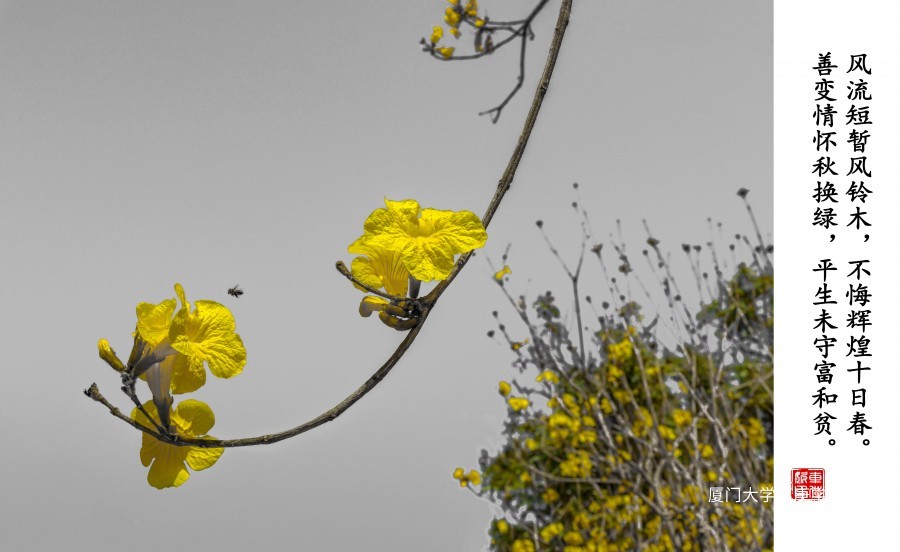 风流短暂风铃木,不悔辉煌十曰春。 善变情怀秋换绿,平生未守富和贫。