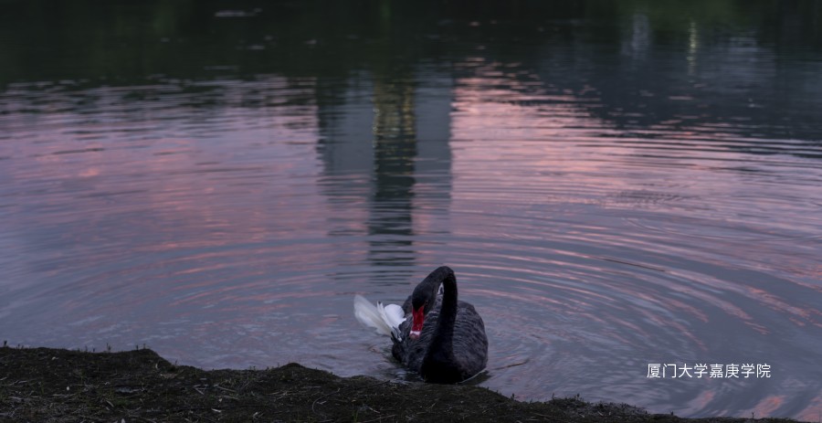 暮色漫染栖霞湖,黑天鹅理羽静安