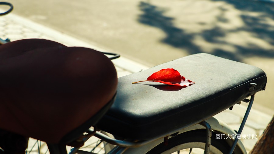 一片红叶落在自行车上,感受秋意。