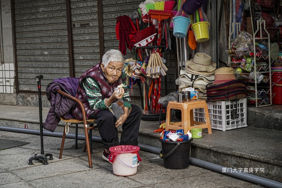 一位老人坐在街头,手里紧握着粮食,一口一口的咀嚼者,看上去生活十分简朴。