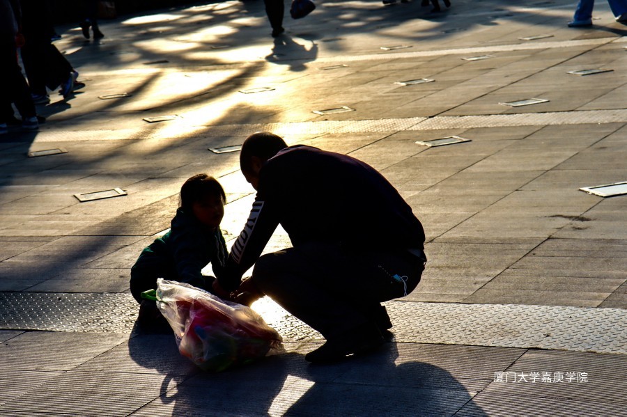 广场上,父亲仔细查看摔倒的小孩是否受伤
