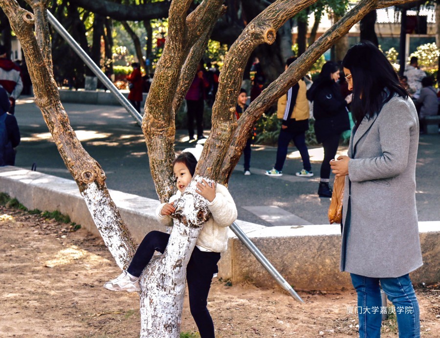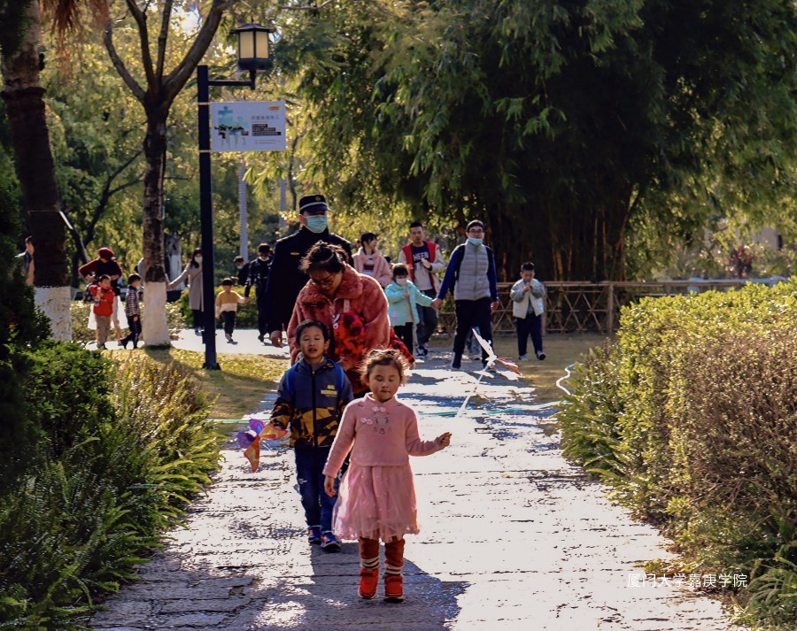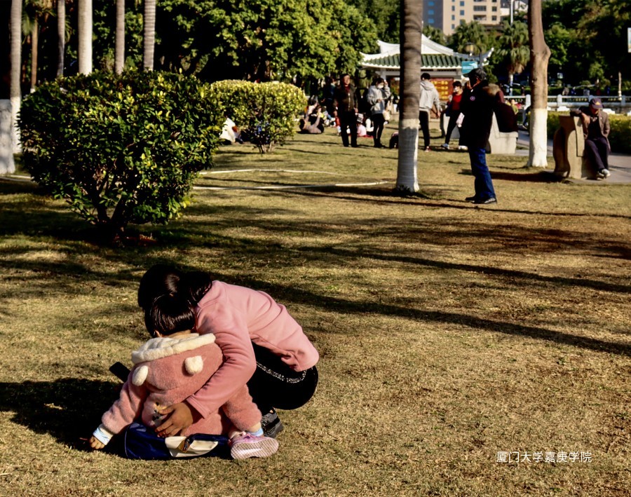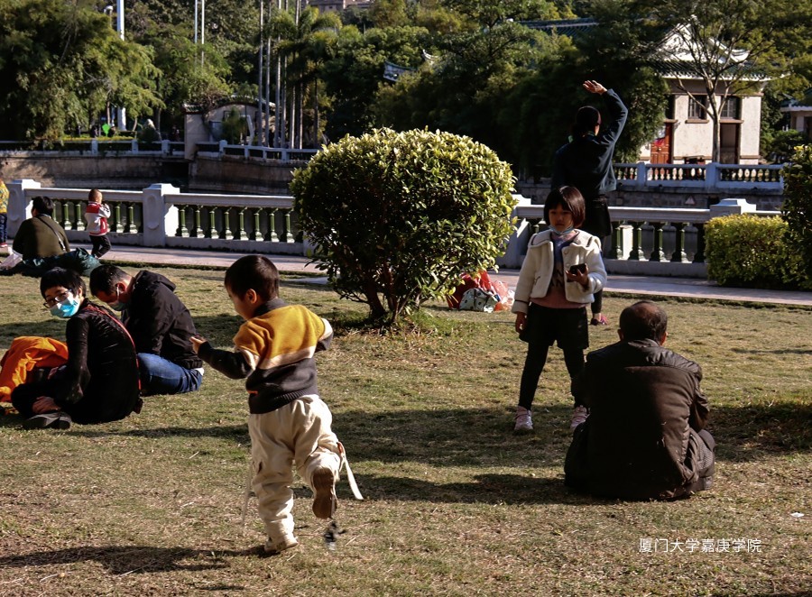 公园里,家长在后方不停追赶嬉戏的小孩