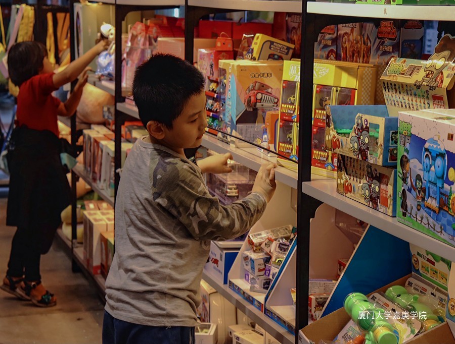 在女生喜欢的装扮玩具前,小女孩挑选着自己的小小喜欢