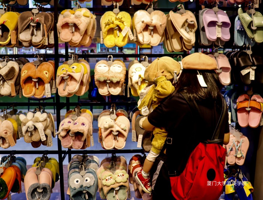 母亲抱着自己的小孩认真挑选生活用品