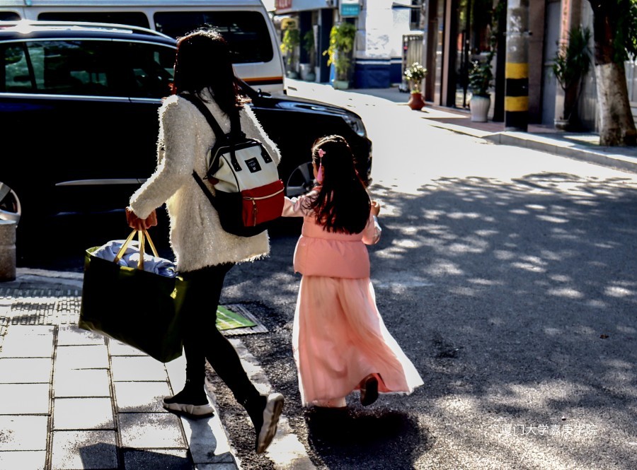 明媚晴天下,母女二人牵着手一同前行
