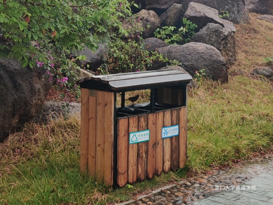 第一场春雨时的月亮桥,空气中弥漫着厚实的泥土气息,伴随着淡淡的花香。木制的垃圾桶的质感与自然完美融入,鸟儿恰好在桶里避雨使画面协调而富有美感。