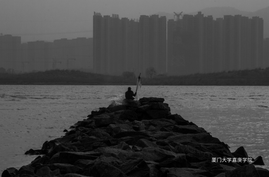 福州闽江边上,一名钓鱼爱好者在孤独着钓着鱼,岸对面是高楼大厦。