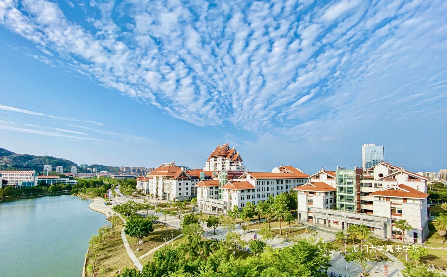 今天又是天朗气清惠风和畅的一天。蓝天白云,空气清新,绿树成荫,习近平总书记曾说过“绿水青山就是金山银山”。嘉庚学院亦是如此。今日厦门大学嘉庚学院的主楼群格外壮观迷人,正因为有了这千变万化的云层,如此错落有致,仿佛身临仙境般,云层从主三楼顶正上方飘向四方,似乎散发着一种壮观浩然之美。