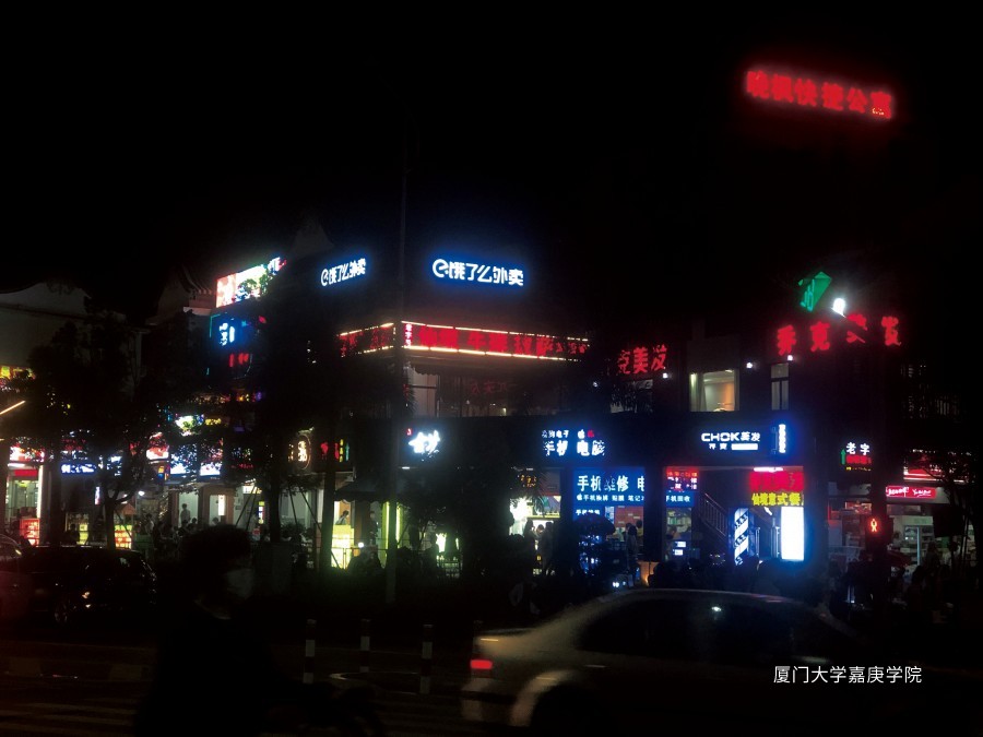 道路上缓慢的车辆,沿街的地摊商贩,夜灯下的小吃招牌,共同勾勒出“嘉园”外的夜晚。