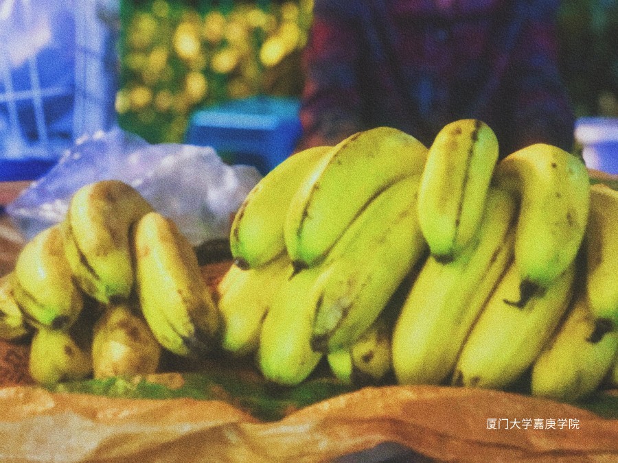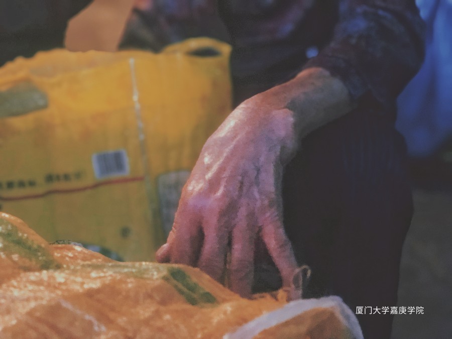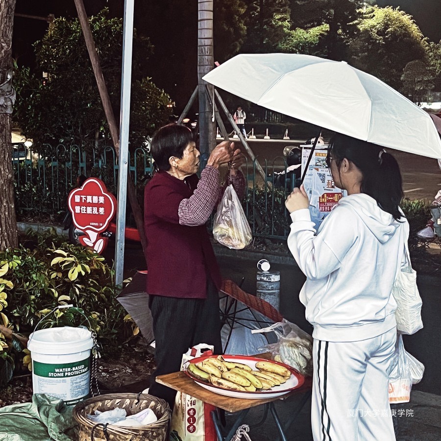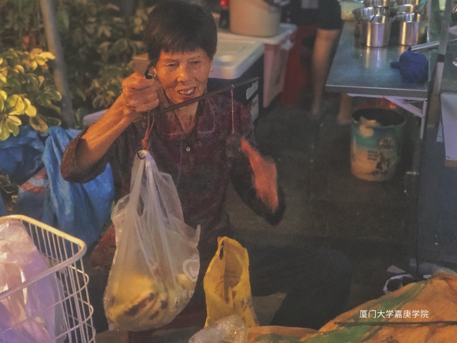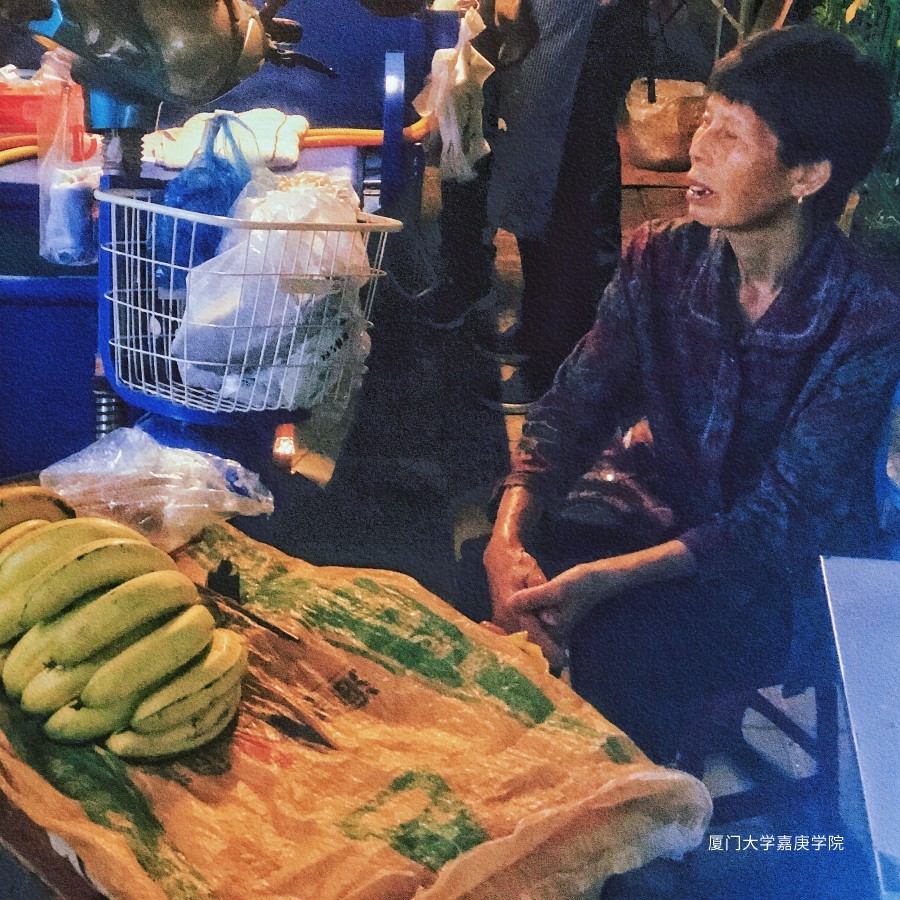 在“嘉”北区校门口过马路后,有一个婆婆经常带着自己种的香蕉、荔枝和杨梅售卖,年老的身躯,颤抖的双手和眼角的沟壑,沧桑的面庞下总含着笑意面对来往的学生,手里的一杆秤,陪伴了她数十年……