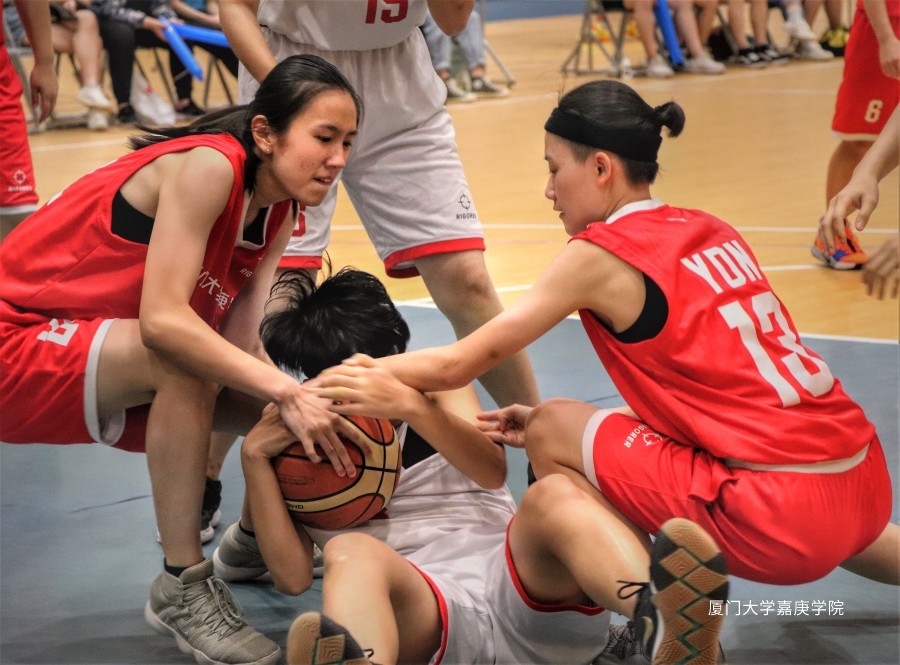 在嘉庚女子篮球联赛的决赛中,女篮比赛激烈程度丝毫不输男篮,图中为红白两队女篮球员进行激烈地争球,场面一度胶着。