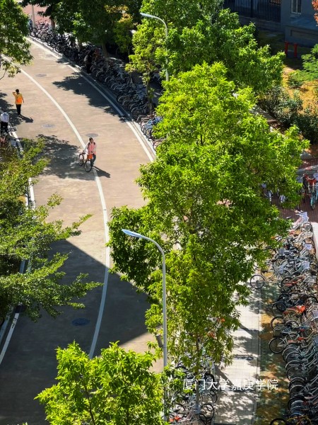 晨光穿过绿树枝桠,学子推车走过,嘉庚的日常在光影中流动。
