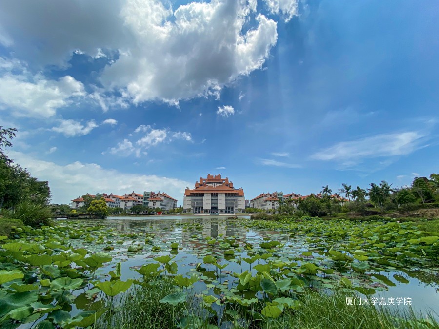 天朗气清,惠风和畅,蓝天白云,正值盛夏,嘉庚学院的荷叶碧绿,在这优美的环境中,迎面而来的即震撼的主楼群。
