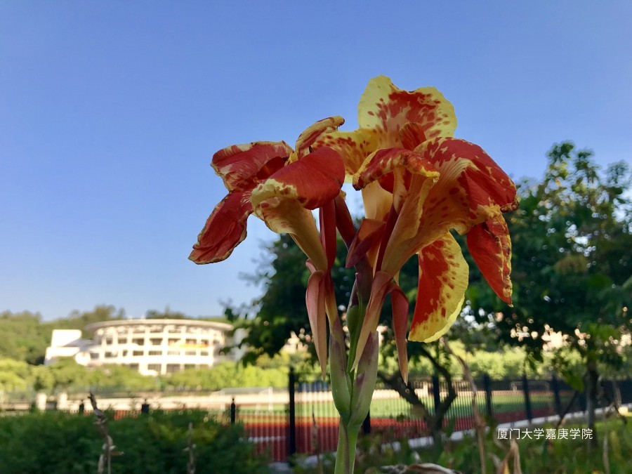 金秋时节,百花凋零,路过田径场,一枝独自绽放的美人蕉花序显得格外显眼!