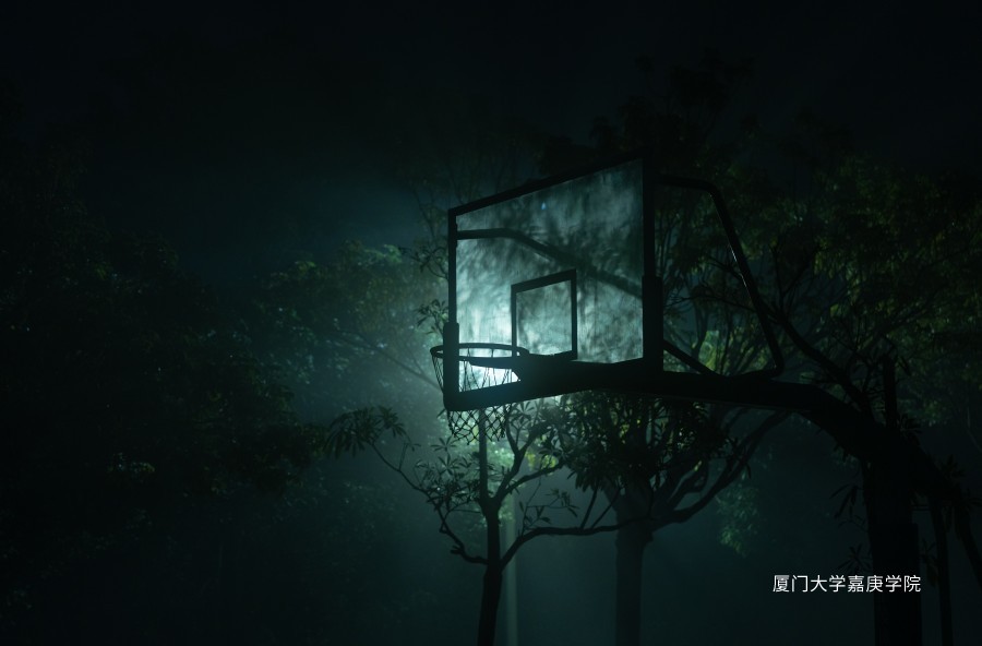 雨天的夜晚,薄雾笼罩的球场上,清冷的灯光给此间平添一份清冷神秘的氛围