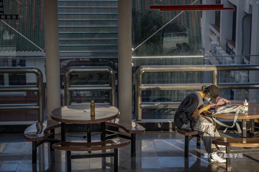 该张照片拍摄于2021年10月31日,课间的闲暇时刻,阳光撒在桌面上,“嘉”人们也坐在圆桌旁休憩。