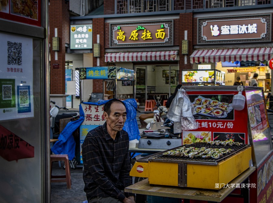 该张照片拍摄于2021年10月31日,校外北区卖生蚝的大叔在静静的等待顾客的到来。
