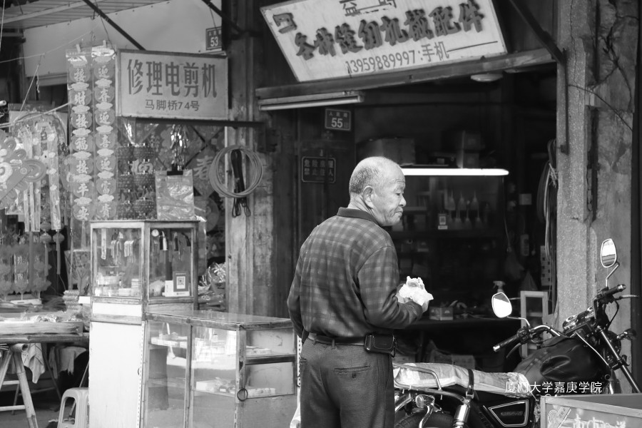 缝纫机、电剪机已许久不见,老爷爷与他们站在一起,令人想起从前的时光……