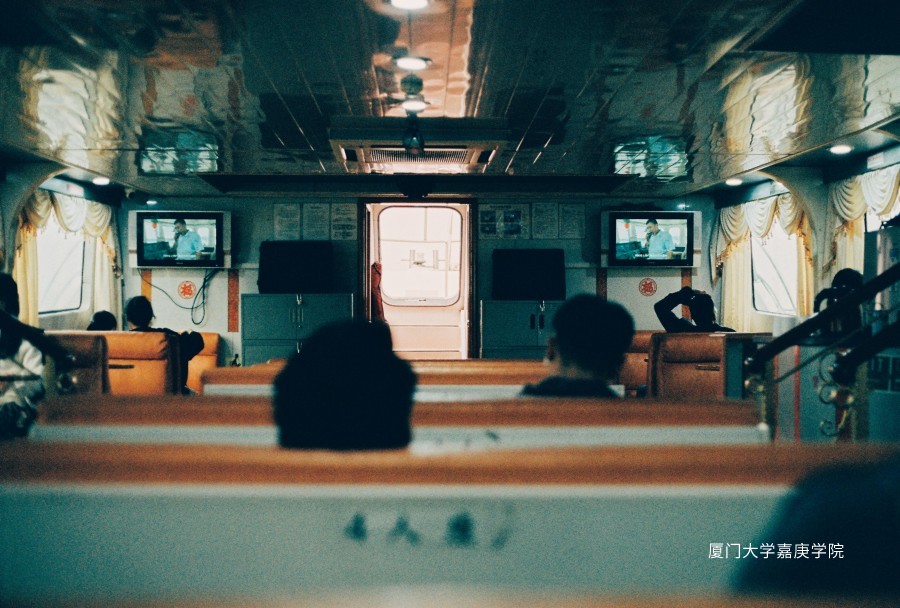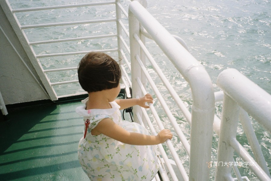 小女孩站在大船一层的甲板上,女孩的妈妈在旁边放着动感旋律的音乐,女孩手扶着栏杆身体随音乐摆动,海风吹起了她的裙摆,蘑菇头可爱又俏皮