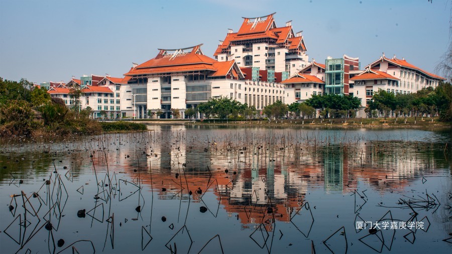 5月,栖霞湖中的荷花一片寂静,荷花叶柄和它们在水中的倒影,形成了一个个极为优美的三角图案,用寂静迎接夏的到来。。与此同时,湖蓝色的湖面中,还倒映着嘉庚学院主楼群,尽显和谐之态。