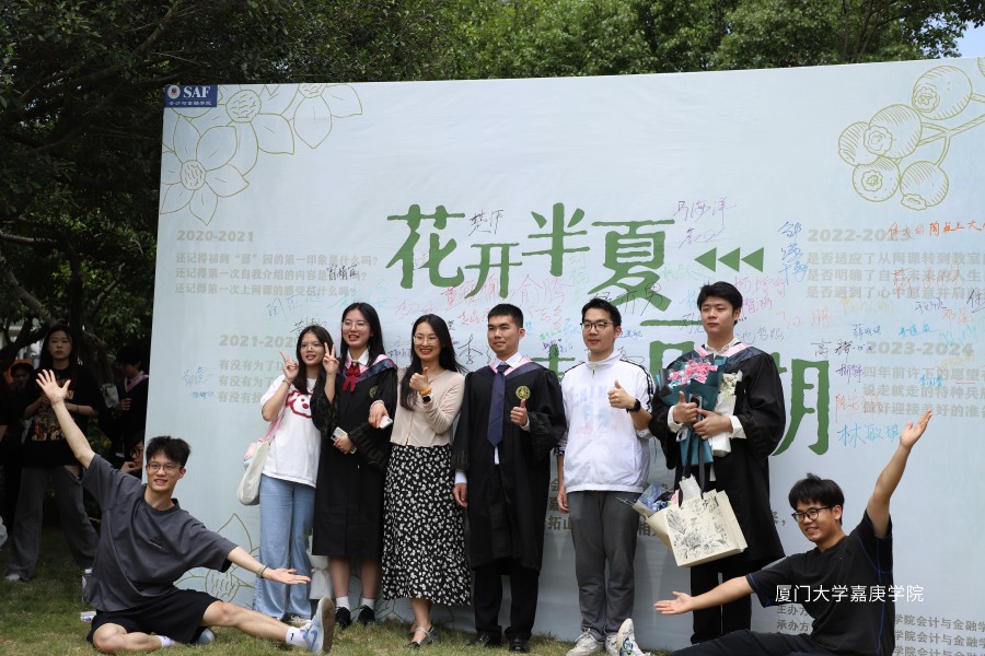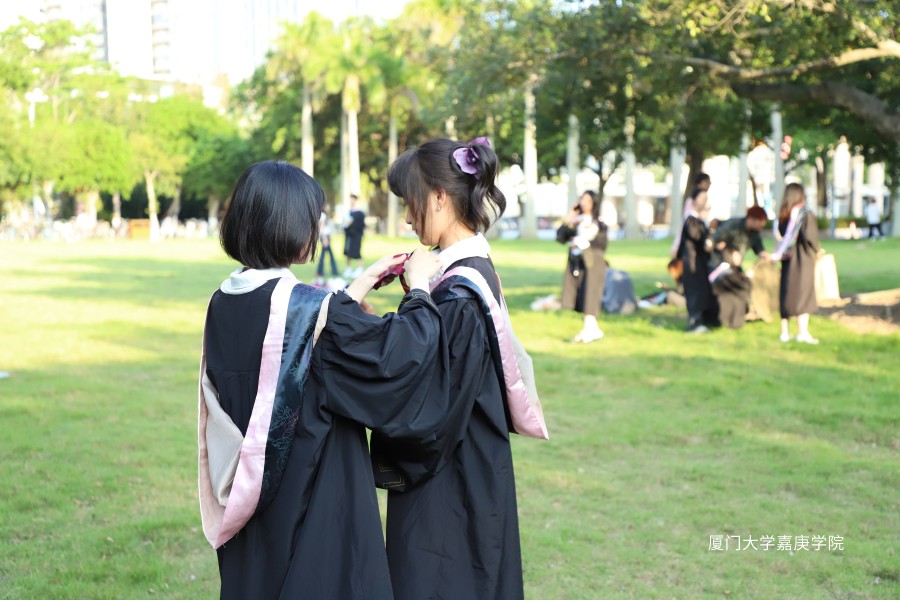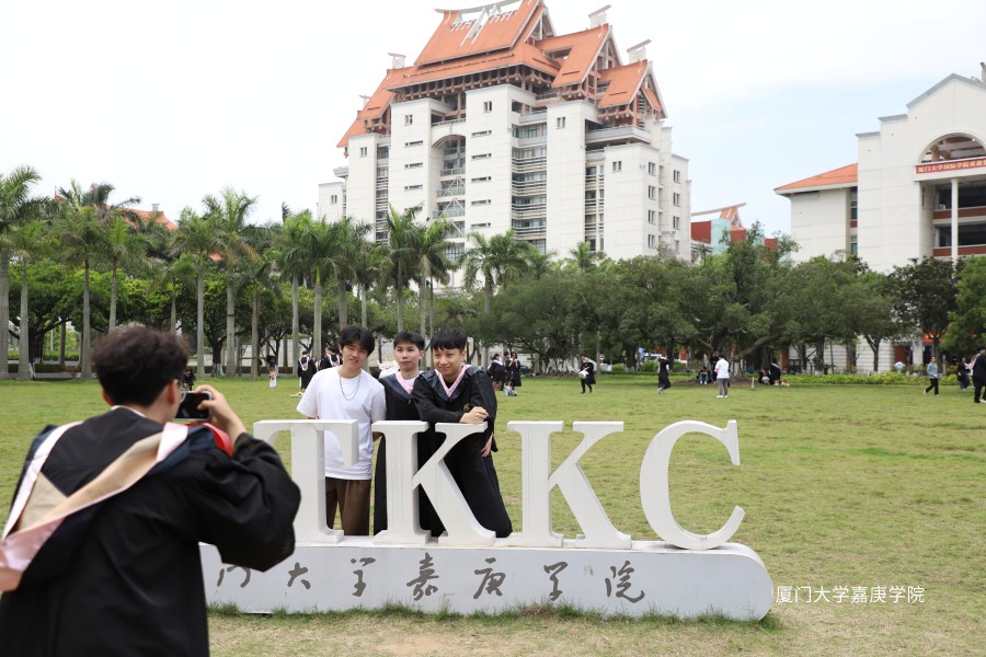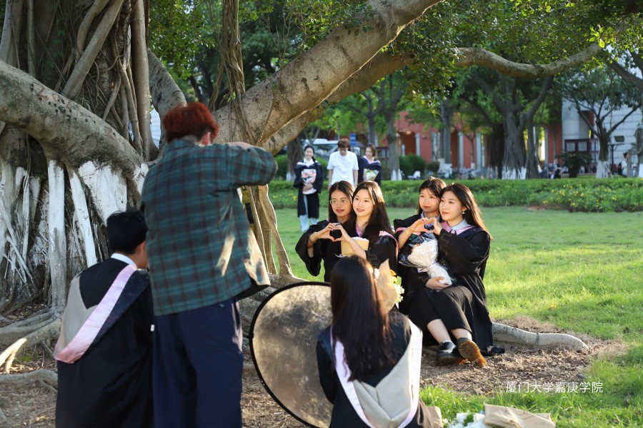 在阳光、教学楼和草坪上,比个耶,毕业啦!