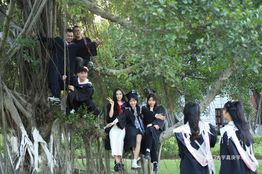 在树上摆着快乐的造型,大树仿佛承载了他们的深厚友谊